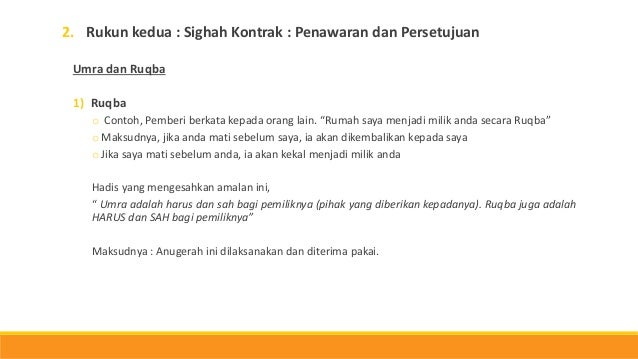 Hibah definisi rukun syarat dan dalil. 1 Aqidain or ang yang memberikan dan orang yang yang diberi atau wahib dan mauhub lah. Syarat Pemberi Hibah Al-Wahib adalah orang yang merdeka bukan budak berakal sehat telah mencapai usia baligh dan pemilik dari barang yang dihibahkan. Sebagaimana transaksi-transaksi yang lain di dalam ijarah juga disyaratkan shigat dari pihak penyewa dan pihak yang menyewakan dengan bentuk kata-kata yang menunjukan terhadap transaksi ijarah yang dilakukan.