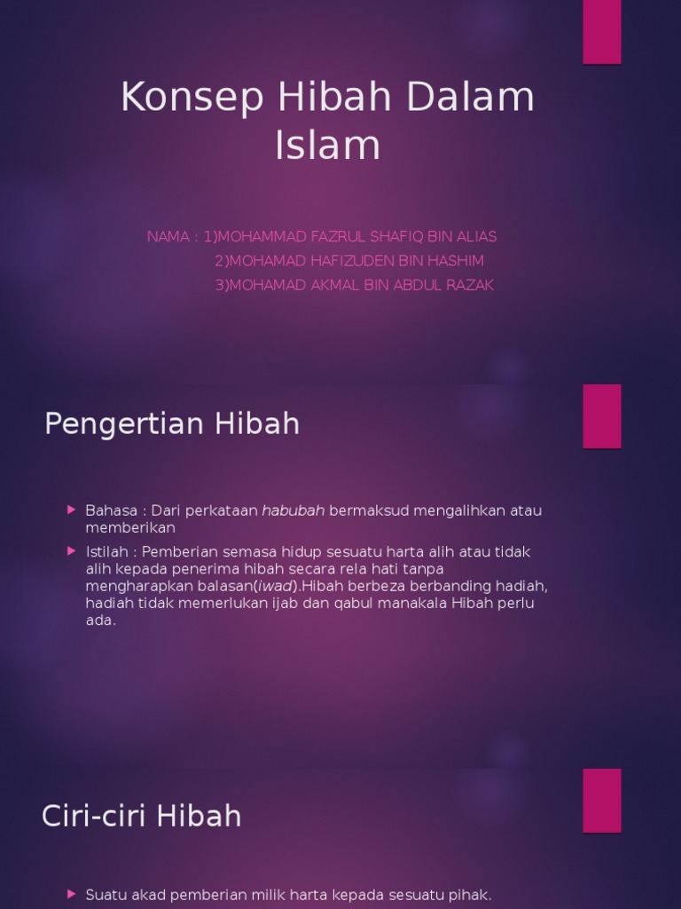 Dalil Hibah terkandung di dalam al- Quran Surah Al-Nisa ayat 4 melalui lafaz Berikanlah mas kahwin kepada wanita-wanita para isteri dengan pemberian yang wajar Surah Al-Baqarah ayat 177 dengan lafaz berikanlah harta yang disayangi itu kepada kaum kerabat. KONSEP HIBAH DALAM ISLAM 11 Pengertian Hibah Hibah dari segi bahasa bermaksud pemberian sama ada dalam bentuk ain atau selainnya. Mengikut undang-undang Islam al-shart al-fasid dalam hibah berlaku apabila penghibah menetapkan syarat yang bertentangan dengan kehendak akad hibah shart ma yunafi muqtada al-hibah.