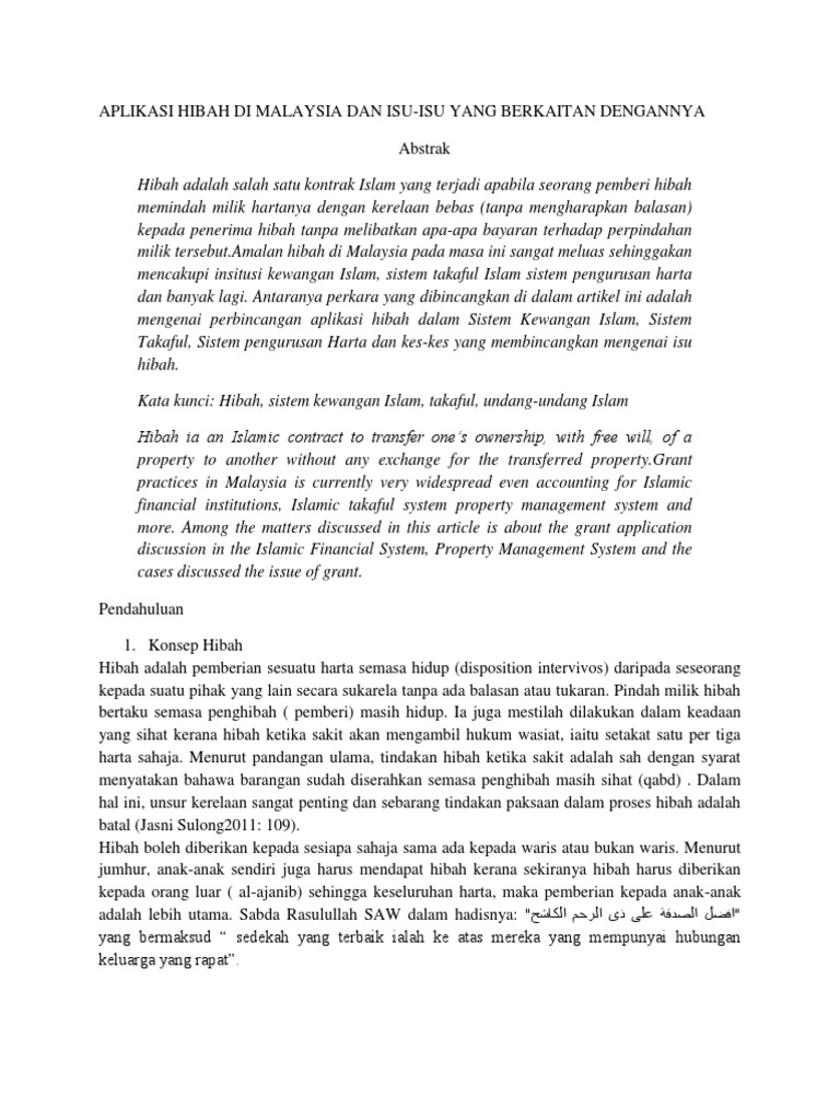 Hibah perlu difahami secara mendalam aspek konsep dan aplikasinya dari segi hukum dan cara pelaksanaan. ISLAMIC RULING ANALYSIS AND ITS APPLICATION IN MALAYSIA Hibah gift inter vivos is a vital instrument in Islamic wealth planning. 3 ABSTRAK Kajian ini bertujuan untuk membincangkan isu-isu perundangan berkaitan hibah di Malaysia.