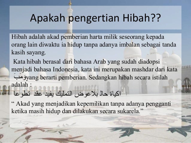 Berikut ini adalah Arti Makna Pengertian Definisi dari kata hibah menurut kamus besar bahasa Indonesia KBBI online dan menurut para ahli bahasaArti kata Hibah - hi-bah n pemberian dng sukarela dng mengalihkan hak atas sesuatu kpd orang lain. Ambillah zakat dari sebagian harta mereka dengan zakat itu kamu membersihkan dan mensucikan mereka QS. Kata wasiat diambil dari kata washshaitu asy-syaia uushiihi artinya aushaltuhu aku menyampaikan sesuatu.