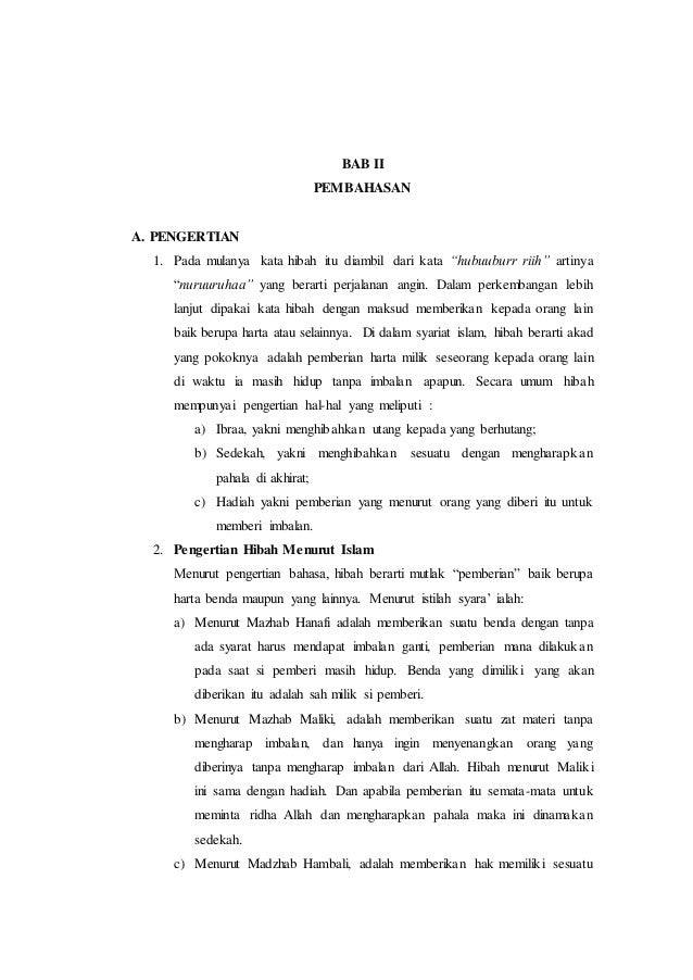 Pengertian Hibah Kata Hibah berasal dari bahasa Arab ﺔﺒه kata ini merupakan mashdar dari kata ﺐهو yang berarti pemberian. Adapun menurut istilah hibah ialah memberikan sesuatu yang nyata kepada orang lain secara suka rela tanpa mengharap balasan atau imbalan apapun. Kata ini berasal dari kata kerja ﺐﮭﯾ -ﺐھو yang berarti memberikan1 Sedangkan dalam kamus lain disebutkan bahwa hibah adalah kata hibah berasal dari bahasa arab ﺔﺒھ yang telah di adopsi menjadi bahasa Indonesia.