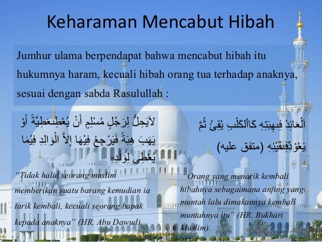1 Jumhur ulama mengatakan bahwa pemberi hibah tidak boleh menarikmencabut hibahnya dalam keadaan apa pun kecuali apabila pemberi hibah itu adalah ayah dan penerima hibah adalah anaknya sendiri. Apabila dengan adanya hibah itu ada kemungkinan menimbulkan iri hati dan fitnah dari pihak lain. Ada pula hibah yang disyaratkan masanya selama orang yang diberi hibah masih hidup dan disebut hibah umri hibah seumur hidup seperti jika seseorang memberikan tempat tinggal kepada.