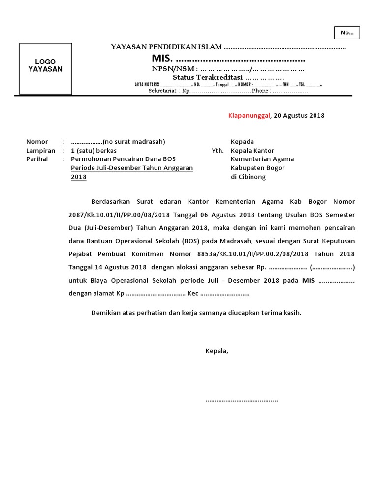 Contoh Surat Permohonan Pencairan Dana Bos Antapedia Com