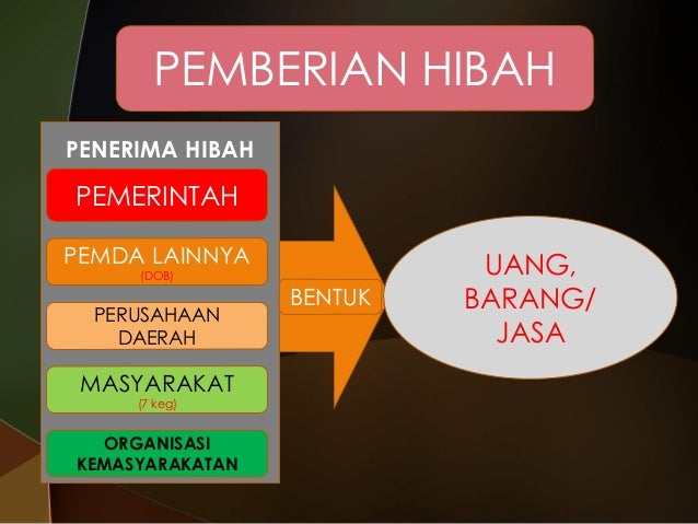 Pihak-pihak tersebut bisa berupa pemerintah daerah pemerintah pusat perusahaan daerah masyarakat serta organisasi masyarakat. Berdasarkan Kamus Besar Bahasa Indonesia KBBI HIBAH ialah pemberian yang dilakukan secara sukarela dengan mengalihkan HAK atas sesuatu kepada pihak lain seperti hak kepemilikan barang.